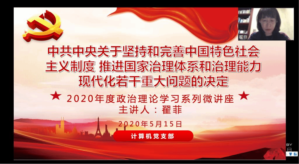 2020年5月15日,根据MG冰球突破网站教职工政治理论学习要求及第二季度基层党组织“两学一做”学习教育安排,为保障疫情防控期间支部与教研室工作的正常进行,进一步提高教职工思想政治素质和理论水平,推进学校教育教学改革发展,计算机党支部和计算机教研室,立足本职、多措并举,充分利用线上多元化的方式,积极开展教职工政治理论云学习,为疫情防控时期,稳步推进教学科研工作提供强有力的思想保障和精神动力。会议由计算机党支部书记翟菲主持。郑小松、翟菲、张晓帆、宗东升四位党员教师分别以《习近平在全国教育大会上的讲话》、《中共中央关于坚持和完善中国特色社会主义制度 推进国家治理体系和治理能力现代化若干重大问题的决定》、《用新时代中国特色社会主义思想铸魂育人、贯彻党的教育方针落实立德树人根本任务》、《把思想政治工作贯穿教育教学全过程》为主题,为教研室全体教师讲授微党课。