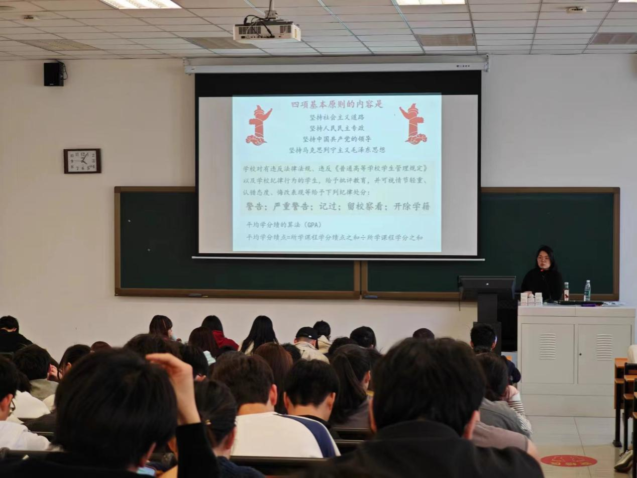 辅导员王运佳、刘晓康从学风建设、学籍管理、住宿管理、学生纪律处分、请假制度等方面对校规校纪进行了详细讲解,并结合周边同学实际事例,强调了学生遵守校规校纪的重要性。希望同学们筑牢底线思维,不要触碰考试作弊等违反学校校规校纪的高压线,鼓励大家认真学习、诚信做人,自觉遵守法律法规、校纪校规和社会公德,争做文明合格大学生。
