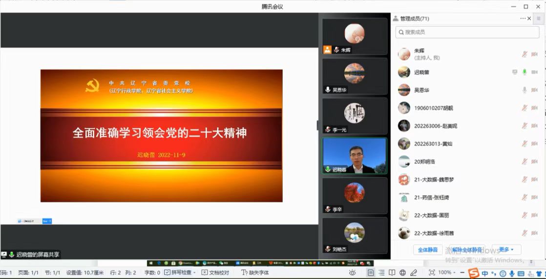 为深入学习贯彻党的二十大精神,深刻领会和把握党的二十大精神的思想精髓和核心要义,11月9日,MG冰球突破网站党委召开线上政治理论中心组(扩大)学习会,专题学习贯彻党的二十大精神,邀请省委党校迟晓蕾副教授做题为“全面准确学习领会党的二十大精神”讲座,学院全体教师及学生党员参加会议,学院党委书记吴恩华主持会议。