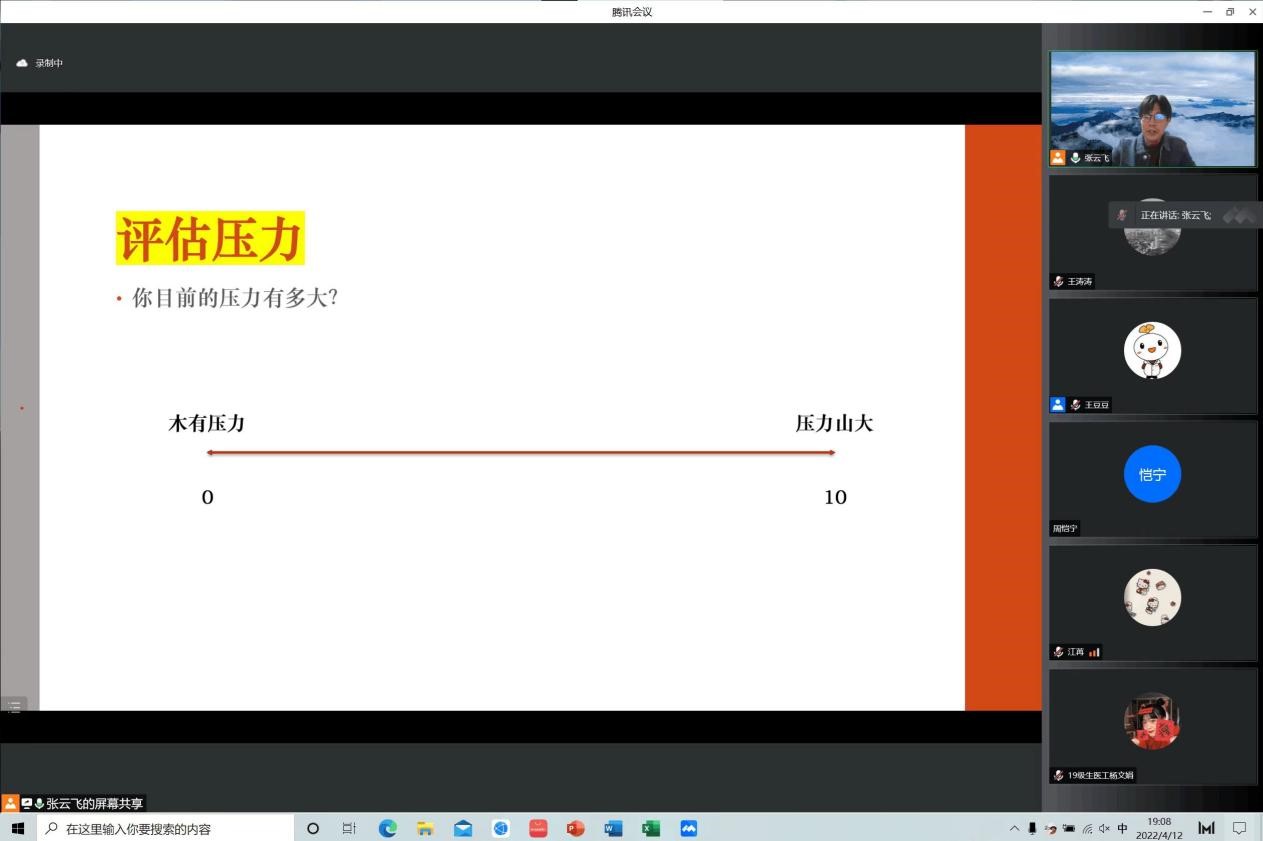 为做好疫情期间全院学生的心理健康服务工作,引导学生以积极正确的心态应对疫情,有针对性的进行防疫心理疏导,提升学生心理素质,4月12日19:00,MG冰球突破网站学生工作办公室邀请沈阳建筑大学心理健康中心张云飞老师,面向学院全体学生开展了以《疫情封校期间的压力管理》为主题的线上心理讲座。