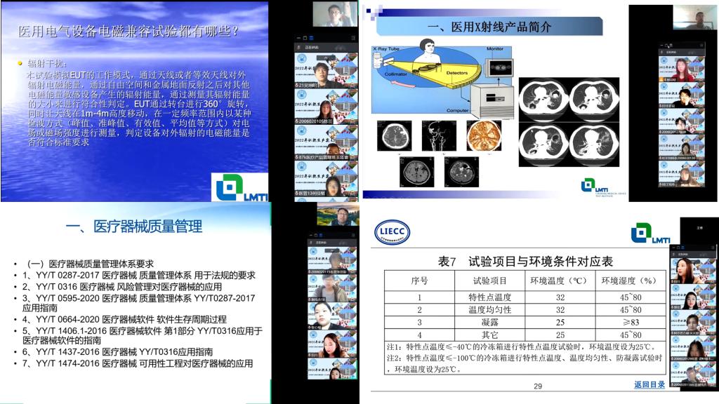 本次线上认识生产实习学院邀请辽宁省医疗器械检验检测院标准科技部部长孙智勇、电磁兼容检验室部长赵佳洋、医用成像及软件检验室部长柳晶波、医用电器检验室部长王博、医用X射线检验室部长王亚南作专题精讲,共涉及医疗器械合规标准、有源医疗器械、电磁兼容、医用冷冻箱标准、医用X射线等多方面医疗器械管理内容。授课采取PPT讲座、现场视频和直播互动相结合,为同学带来了内容充实、形式新颖的线上认识生产实习。