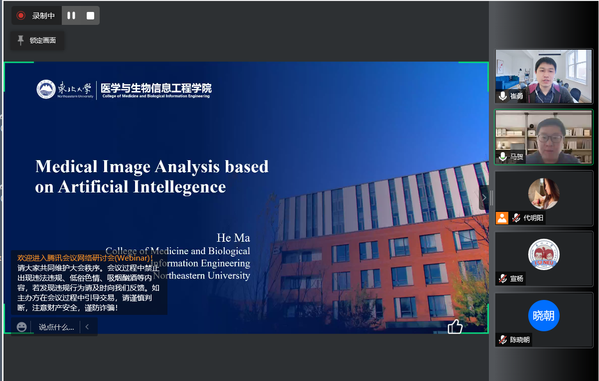 4月16日,由研究生院、辽宁省药学研究生创新与学术交流中心、MG冰球突破网站联合举办的“沈药无涯论坛”第289讲——马贺副教授学术报告会于线上如期举行。会议邀请到东北大学医学与生物信息工程学院副院长马贺副教授做题为《基于人工智能的医学影像数据分析》的学术报告。报告会由MG冰球突破网站副院长崔勇主持,100余名师生在线收看。