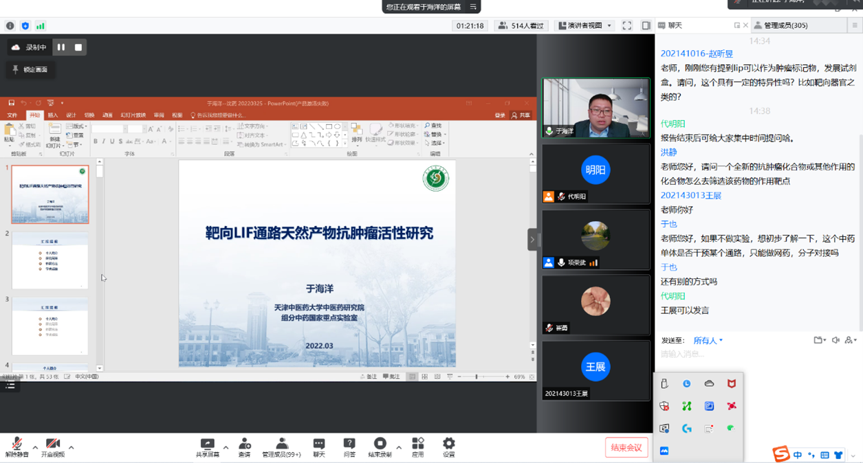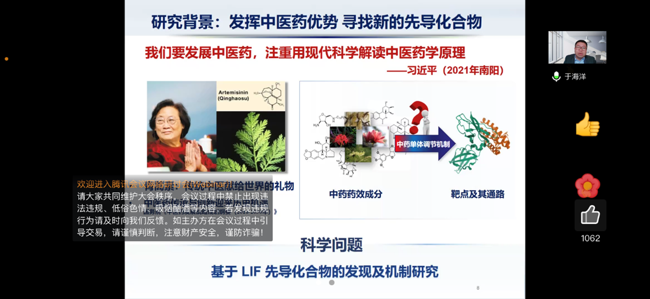 于海洋教授从研究背景、科研方法、学术成果三个方面,围绕调节肿瘤发生、发展的关键原癌基因LIF,详细讲解了从单味中药、复方中筛选出的若干个靶向LIF及其下游关键蛋白的小分子化合物,阐明其作用机理,为抗肿瘤药物的研发奠定了坚实的科学基础。同时于海洋教授结合自身的科研经历,同与会教师分享科研思路及科研心得。在报告最后,于教授与在线的师生就学术问题进行了充分的交流与讨论。
