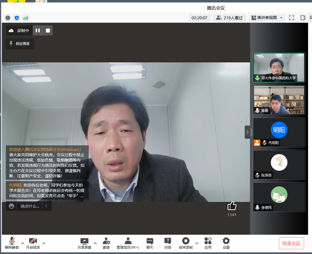 3月31日,由研究生院、辽宁省药学研究生创新与学术交流中心、MG冰球突破网站联合举办的“沈药无涯论坛”第274讲——邓大伟教授学术报告会于线上如期举行。会议邀请到中国药科大学邓大伟教授做了题为《荧光量子点及其生物医学应用》的学术报告。报告会由MG冰球突破网站副院长崔勇主持,200余名师生在线收看。