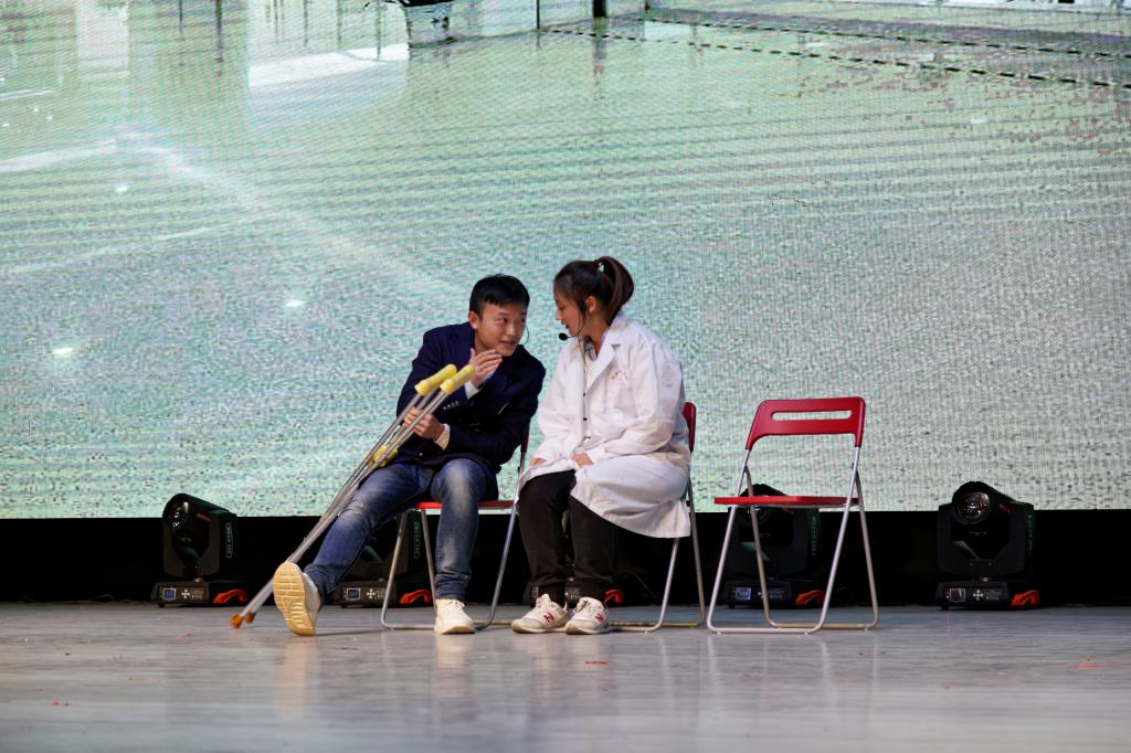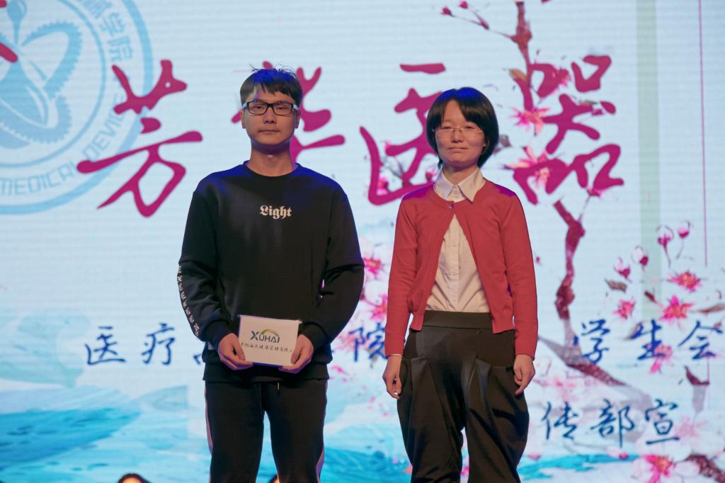 晚会节目进行到一半,院党委书记李哲、天津众康源医疗科技有限公司副总经理彭学静抽取了三名同学为本场的幸运观众,并为其颁发由企业提供的精美纪念品。