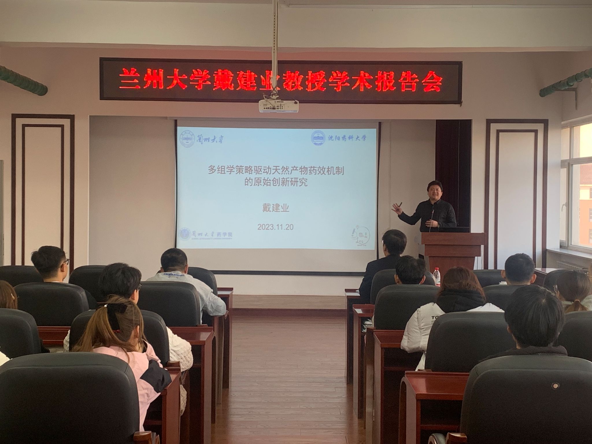 11月20日,值此学校建校92周年之际,兰州大学药学院、我校72期校友戴建业教授应邀为学院师生做题为《多组学策略驱动天然产物药效机制的原始创新研究》学术报告。报告会由学院副院长项荣武主持,研究生及本科生共计近100人参会。