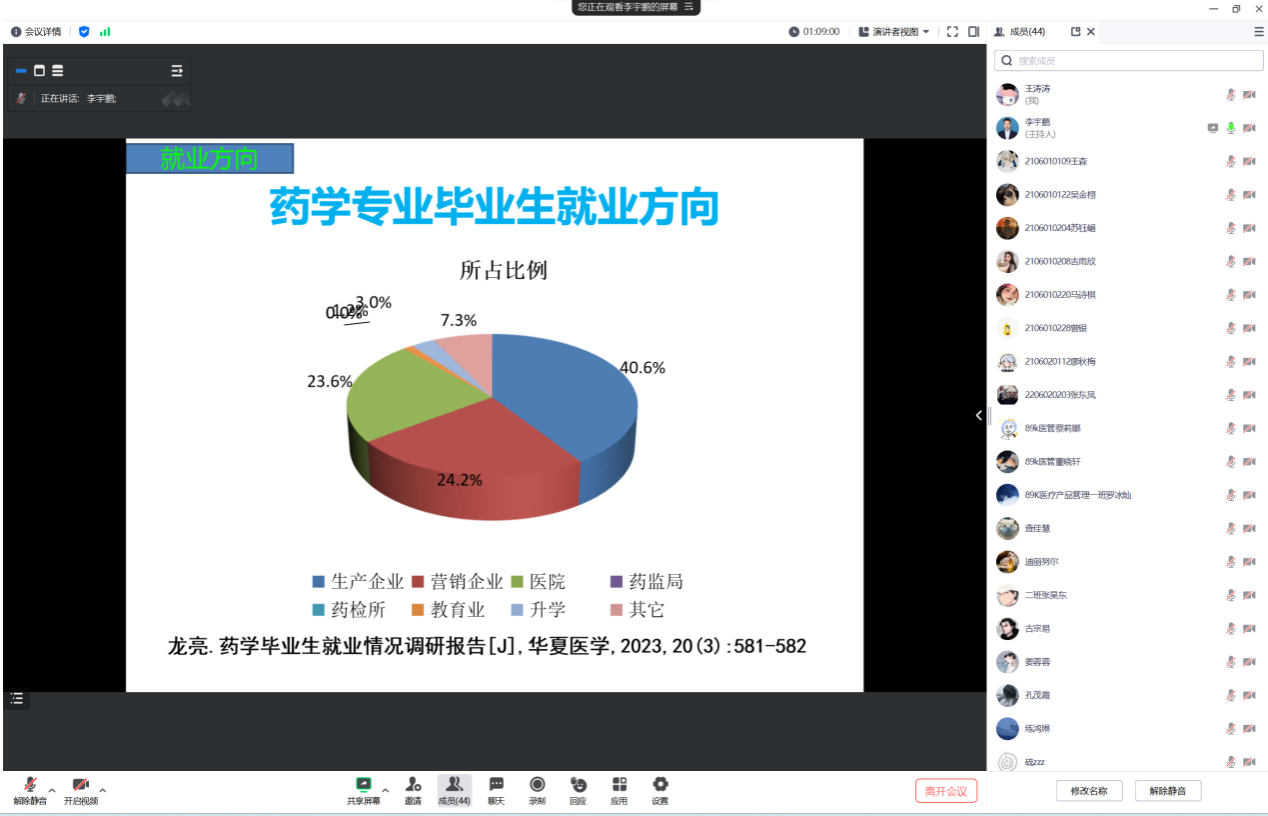 交流分享中,李宇鹏强调,一是要准确认识自己,逐步转变就业观念,合理规划职业生涯;二是要对医药行业的发展趋势、人才需求趋势、供需关系变化趋势进行认真的分析和调研,不盲目不盲从,不自卑不浮躁;三是要努力抓住就业、实习的机会,多和用单人位沟通接触,尽快确定意向就业岗位。